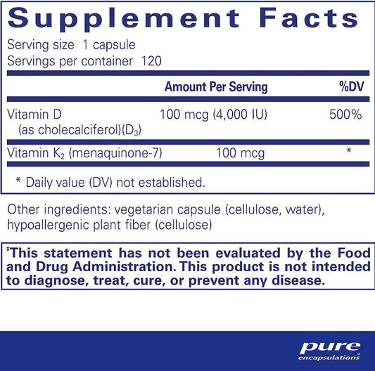 Vitamin D3 & K2, 4000 IU/100 mcg, 120 Capsules, by Pure Encapsulations