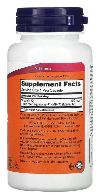 MK-7 Vitamin K-2, 100 mcg, 120 Veg Capsules, by NOW