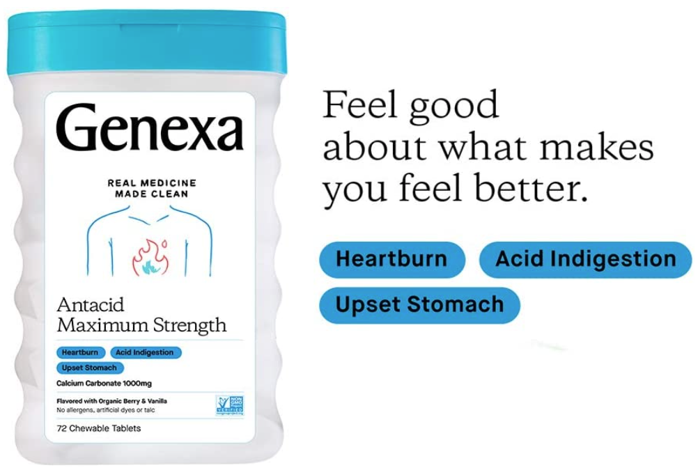 Genexa Antacid Maximum Strength is real medicine, made clean - providing maximum strength relief from heartburn, acid indigestion, sour stomach, and upset stomach associated with these symptoms.