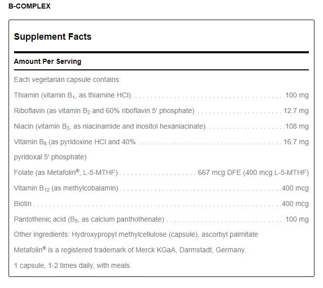 B-Complex is unique, including Metafolin and Methylcobalamin Vitamin B12 in its formulation. Metafolin contains only the S isomer of 5-MTHF and has been shown to be the only form of folate to be able to cross the blood-brain barrier. Studies indicate that methylcobalamin, a coenzyme form of B12, may be better utilized and better retained in the body.