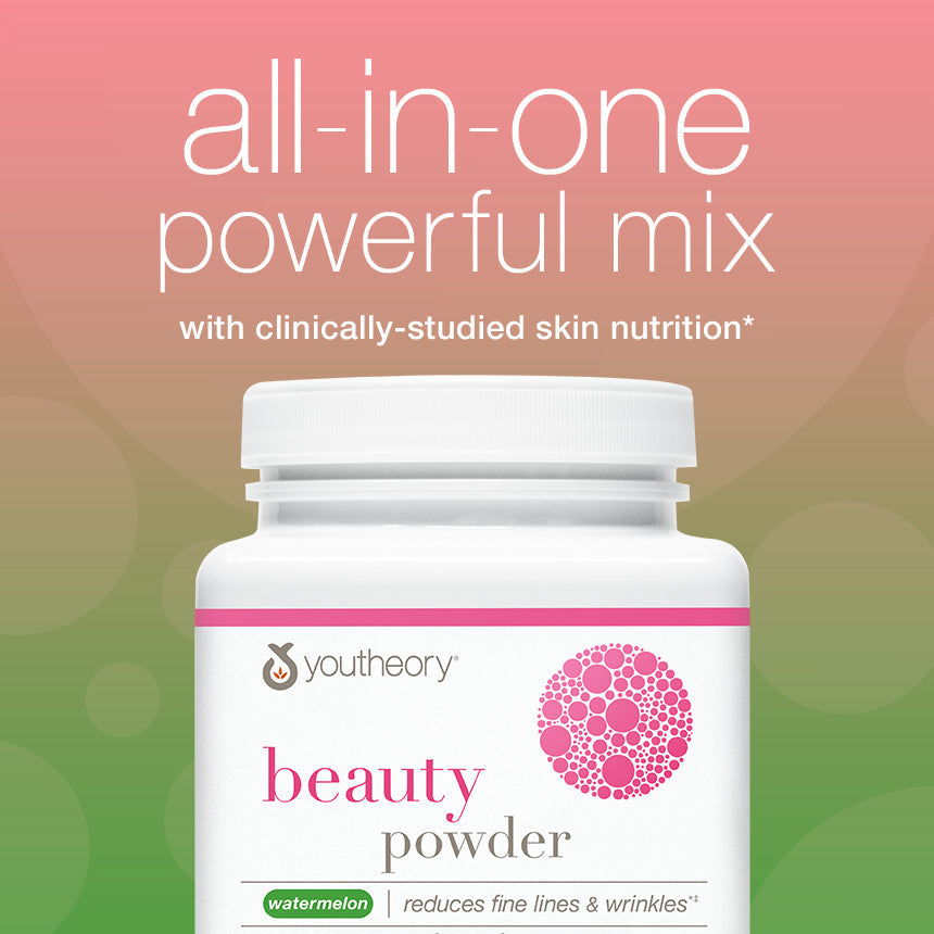 Youtheory® Beauty Powder is an all-in-one beauty product that boasts clinically-supported skin nutrition. This refreshing watermelon drink mix combines some of most efficacious and on-trend beauty ingredients in the marketplace. It is designed to help combat the visible signs of aging while increasing the skin’s antioxidant defenses. Use daily for optimum results.