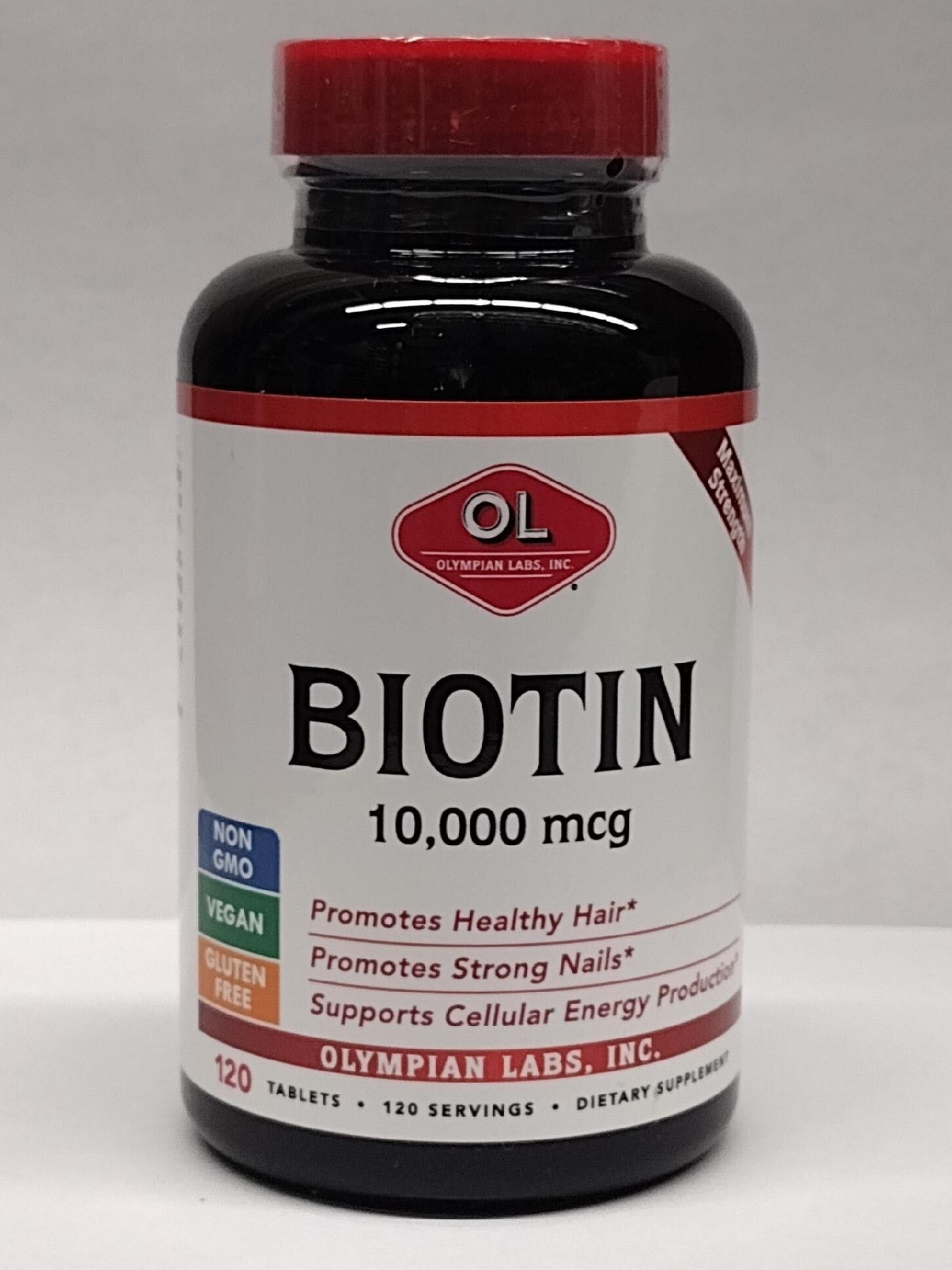 Biotin Olympian Labs supports the health of the skin, thick shiny hair, and strong nails as well as the digestive tract.