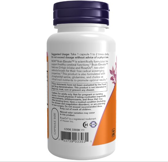 NOW® Brain Elevate™ is scientifically formulated to support healthy cerebral functions.* Brain Elevate™ features Ginkgo biloba and RoseOx®, two plant extracts known for their free radical scavenging properties.* This product is also formulated with phosphatidyl serine, glutamine, and choline as critical brain nutrients to promote optimal results.*