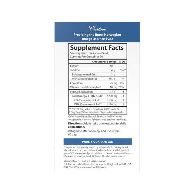 Carlson Med Omega is a highly concentrated, balanced, professional-strength formula. It provides 2,700 mg of omega-3 fatty acids per teaspoonful, including 1,180 mg each of EPA and DHA. Med Omega has a delicious lemon-lime flavor that's received numerous awards for its taste and quality.
