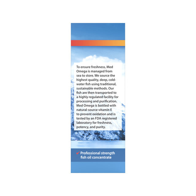 To ensure maximum freshness, Med Omega is closely managed from sea to store. We source the highest quality, deep, cold water fish using traditional, sustainable methods. And like all Carlson omega-3s, it's tested by an FDA-registered laboratory for freshness, potency, and purity.