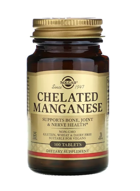 Manganese supports bone health and plays a role in joint health. Manganese-containing enzymes are needed for healthy cartilage production. Manganese also nourishes nerves and works with Super Oxide Dismutase (SOD) to function as an antioxidant in cells. This formulation provides a patented form of chelated manganese.