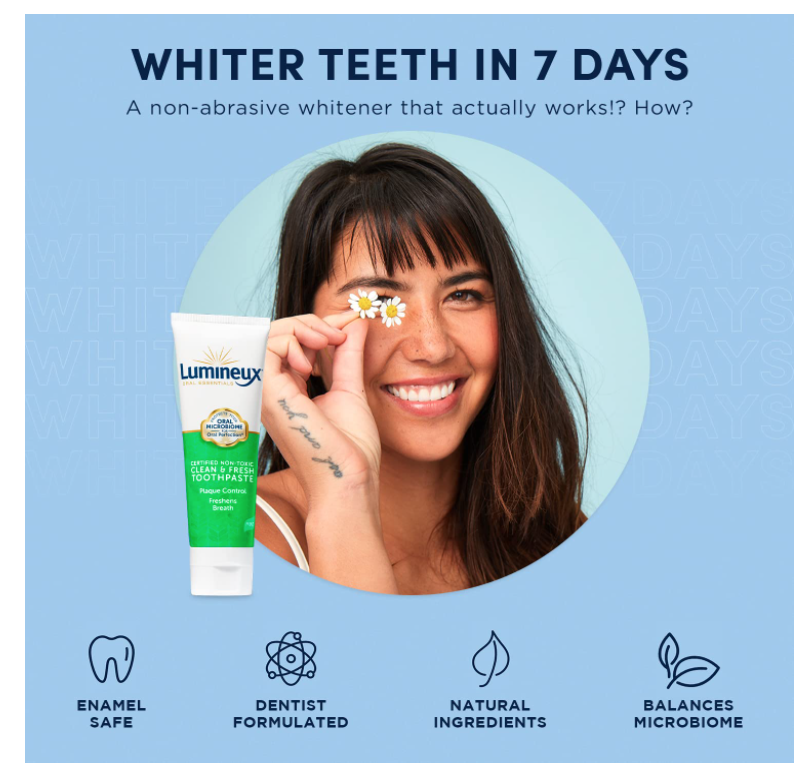 Lumineux® Clean & Fresh Toothpaste is clinically proven to freshen breath and achieve visibly cleaner teeth and healthy looking gums in as little as two weeks.†