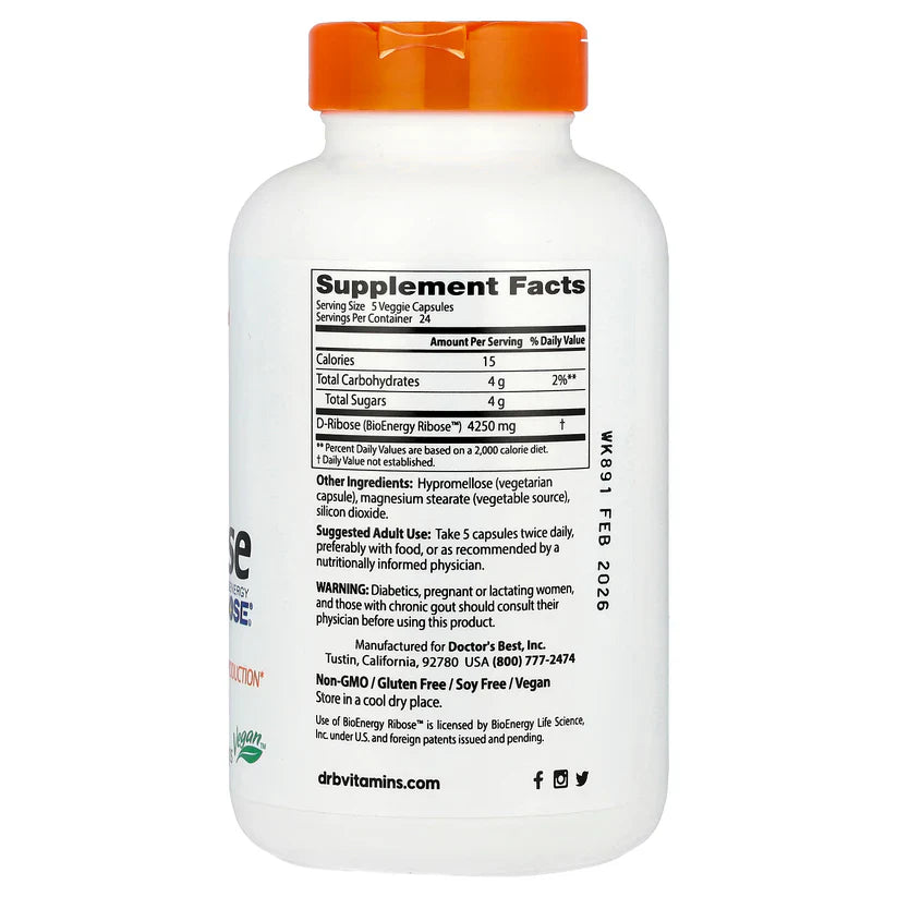 Ribose is a unique 5-carbon carbohydrate that is a fundamental building block of ATP (adenosine triphosphate), the source for all cellular energy. Ribose is the starting point and rate limiting compound in the synthesis of these fundamental cellular compounds. The availability of ribose determines the rate at which they can be made by our cells and tissues. Studies have shown that ribose supplementation can enhance cardiac energy levels and support cardiovascular metabolism. Further studies suggest that ribose plays a role in supporting muscle energy recovery after exercise. Exercise increases free radical production in muscle tissue. Ribose may strengthen and support the body's crucial antioxidant defenses.