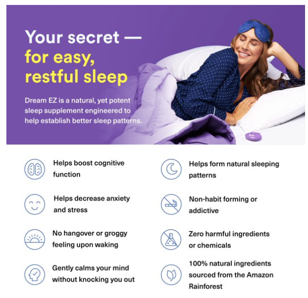 Dream EZ is designed to train your body to sleep correctly by lowering cortisol (chemical that creates anxiety and prevents you from sleeping) and increasing melatonin (the natural hormone in your body that helps you sleep) naturally.