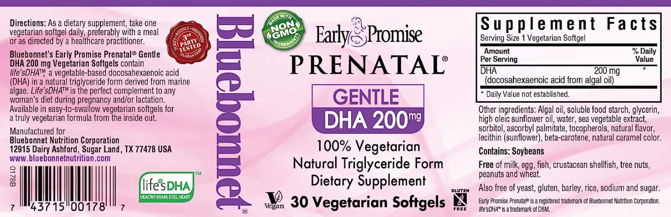 Bluebonnet's Early Promise Prenatal® Gentle DHA 200 mg Vegetarian Softgels contains life's DHA, a vegetable-based docosahexaenic acid (DHA) in a natural triglyceride form derived from marine algae. Life's DHA™ is the perfect complement to any woman's diet during pregnancy and/or lactation. Available in easy-to-swallow vegetarian softgels for a truly vegetarian formula from the inside out.