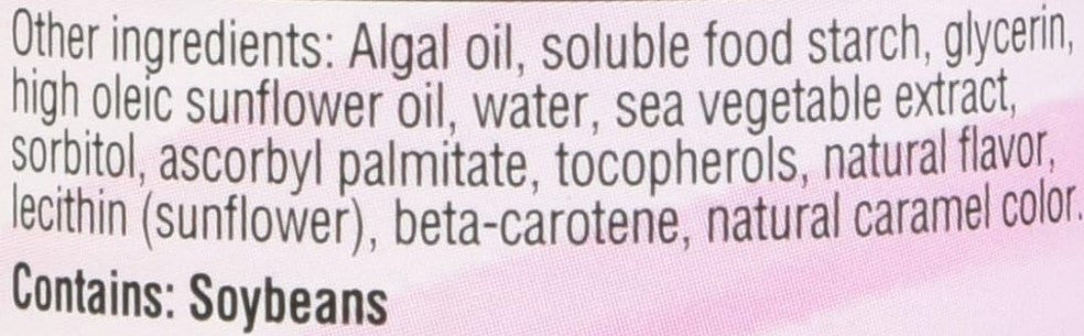 Other Ingredients: Algal oil, soluble food starch, glycerin, high oleic sunflower oil, water, sea vegetable extract sorbitol, ascorbyl palmitate, tocopherols, natural flavor, lecithin (sunflower), beta-carotene, natural caramel color.