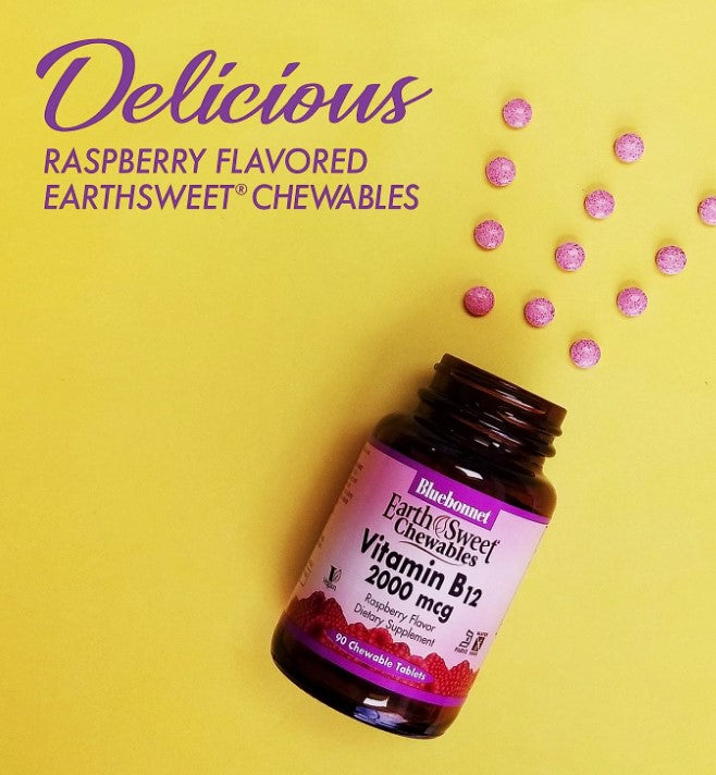 Bluebonnet's EarthSweet® Chewables Vitamin B12 2000 mcg Tablets are formulated with crystalline vitamin B12 that supports cellular energy production and nervous system health in a delicious raspberry flavor. Sweetened with EarthSweet® a proprietary sweetening mix of fruit powders and sugar cane crystals.