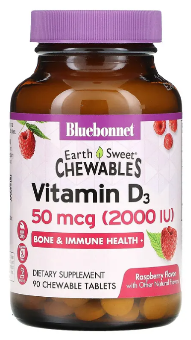 EarthSweet Chewables, Vitamin D3, 2,000 IU, 90 Raspberry Chewable Tablets, by Bluebonnet
