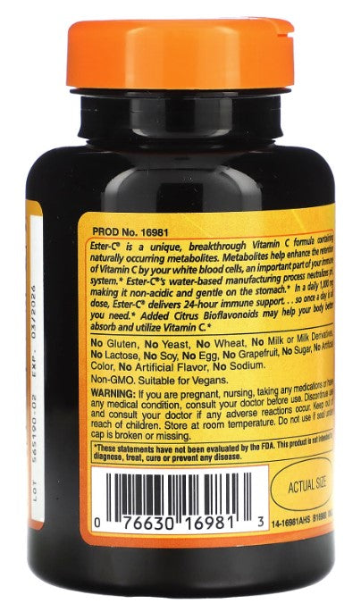 Ester-C® is a unique, breakthrough Vitamin C formula containing naturally occurring metabolites. Metabolites help enhance the retention of Vitamin C by your white blood cells, an important part of your immune system.* Ester-C®‘s water-based manufacturing process neutralizes pH, making it non-acidic and gentle on the stomach.* In a daily 1,000 mg dose, Ester-C® delivers 24-hour immune support… so once a day is all you need.* Added Citrus Bioflavonoids may help your body better absorb and utilize Vitamin C.*