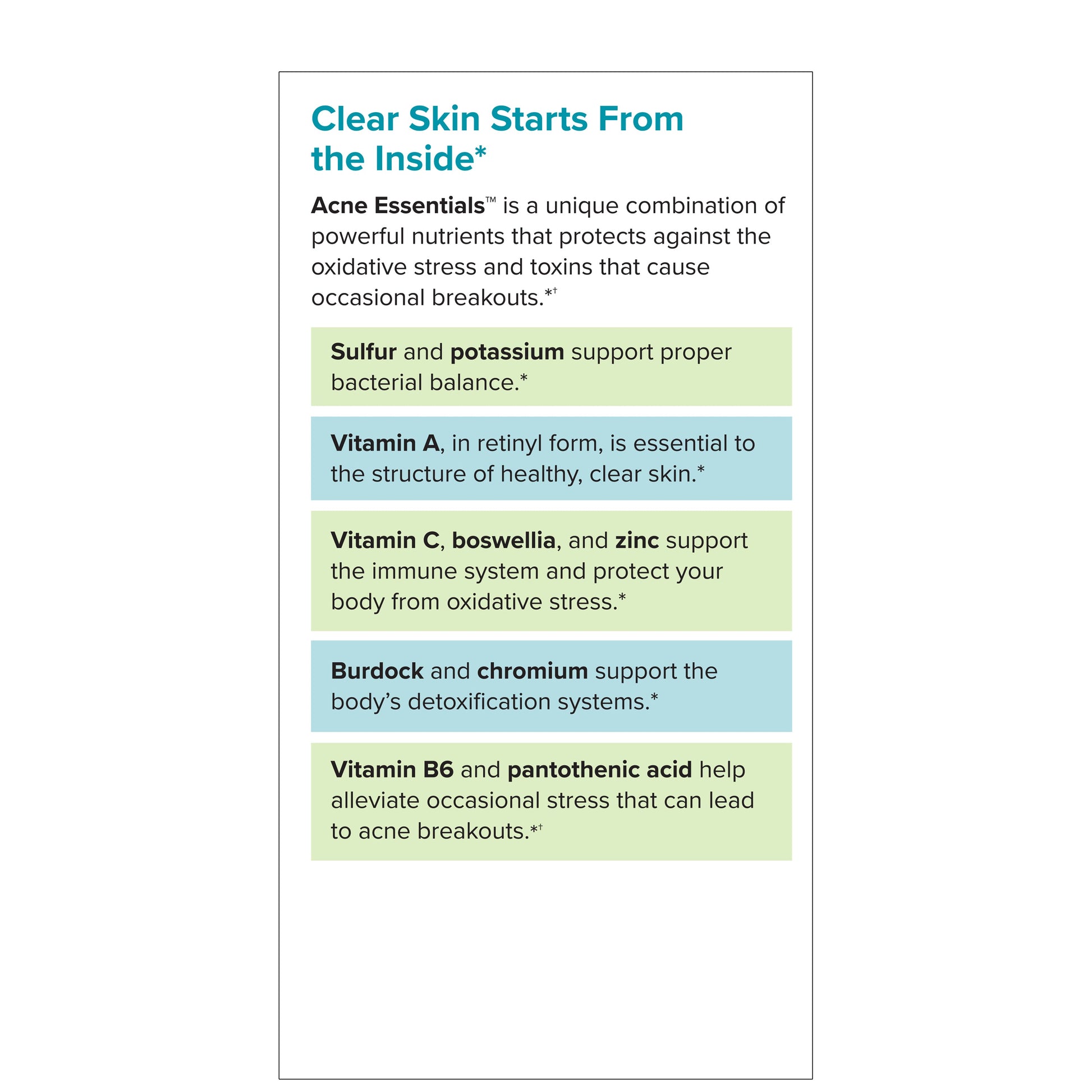 - Vitamin B6 and Pantothenic Acid help alleviate stress that can lead to acne breakouts†