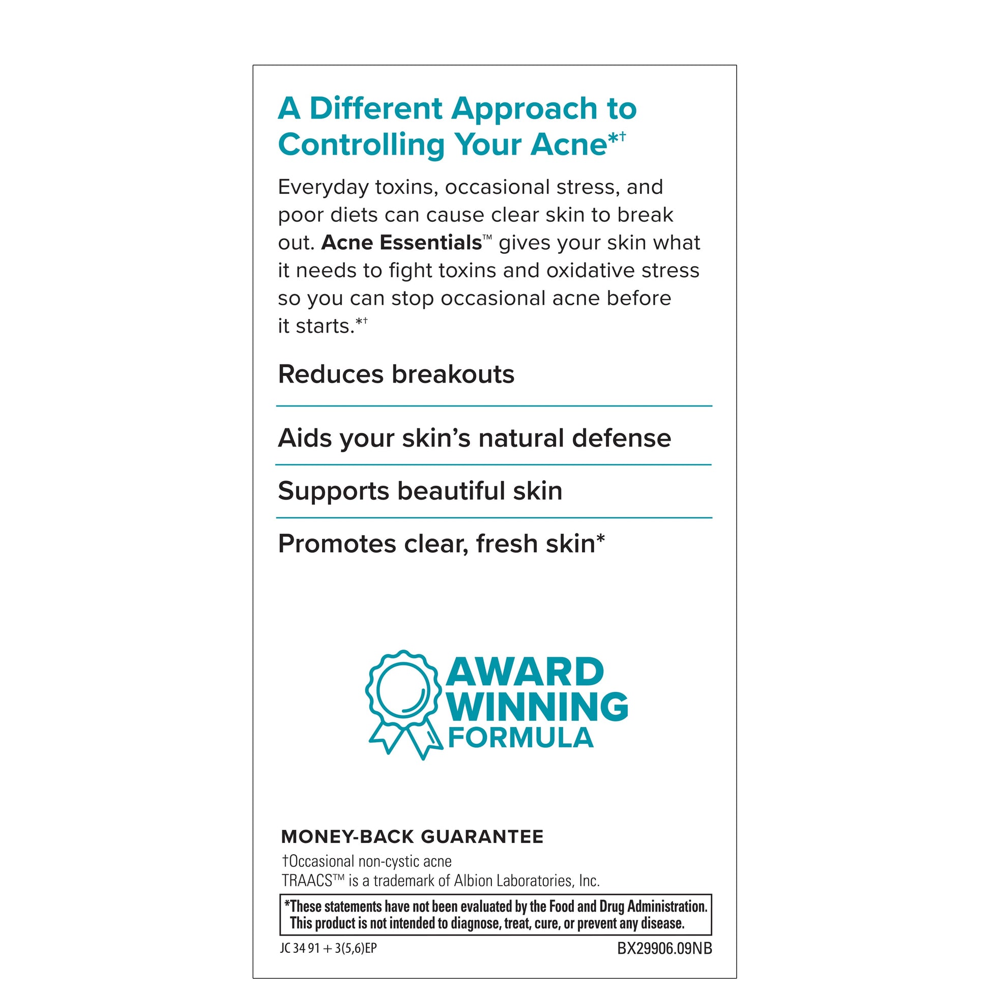 Everyday toxins, stress, and poor diets can cause clear skin to break out. Acne Essentials gives your skin what it needs to fight toxins and oxidative stress so you can stop occasional acne before it starts.†
