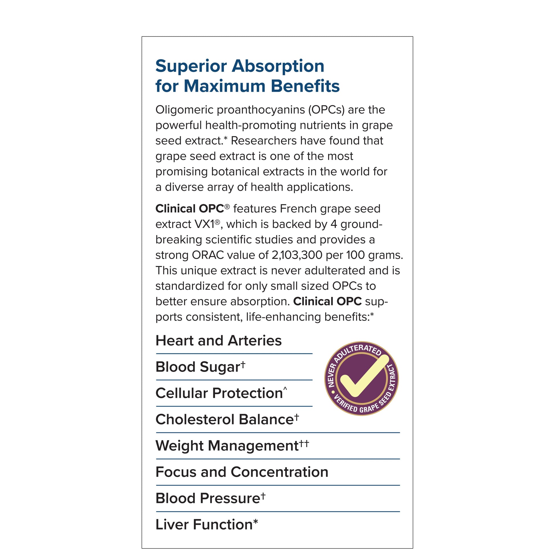 Clinical OPC has superantioxidant power. In a comparison to 7 other grape seed extracts, Clinical OPC had the strongest ORAC value of 2,103,300 per 100 grams.
