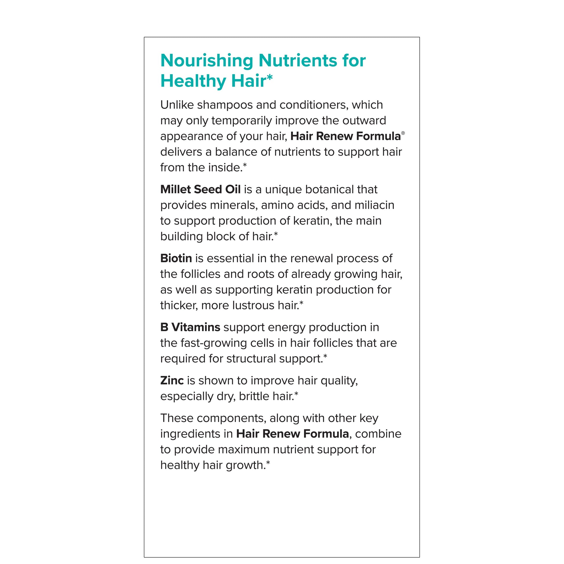 Unlike shampoos and conditioners, which may only temporarily improve the outward appearance of your hair, Hair Renew Formula delivers a balance of nutrients to support hair from the inside