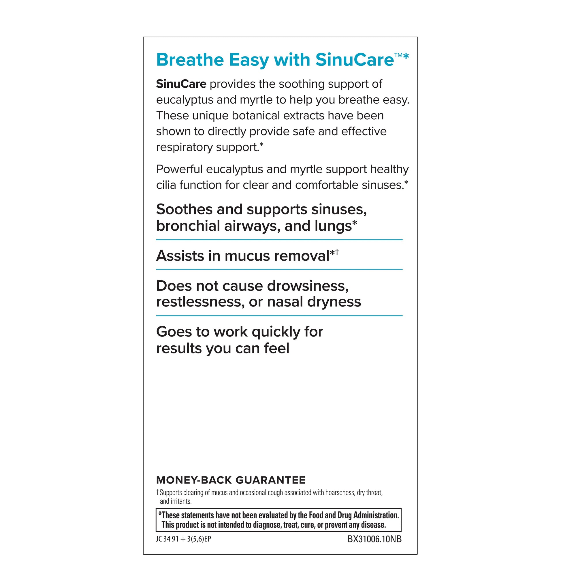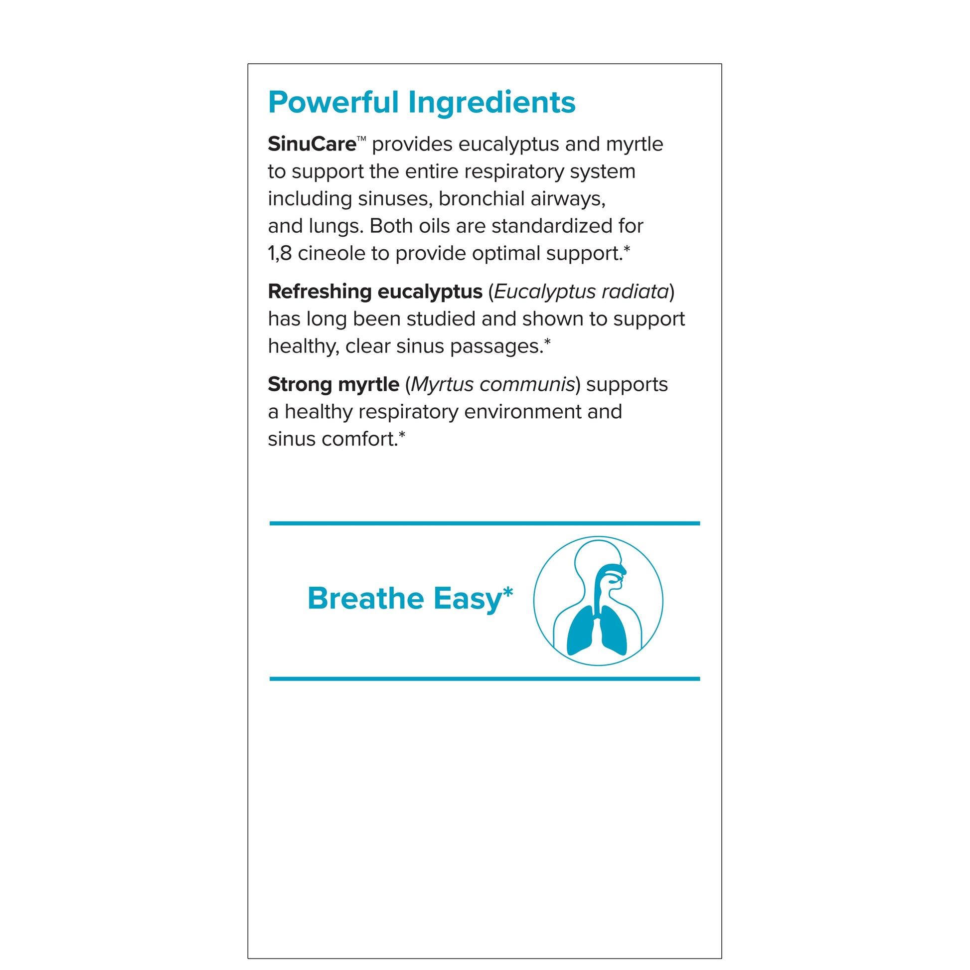 SinuCare provides the soothing support of Eucalyptus and Myrtle to help you breathe easy. These unique botanical extracts have been shown to directly provide effective respiratory system support in part by their ability to support healthy cilia activity.
