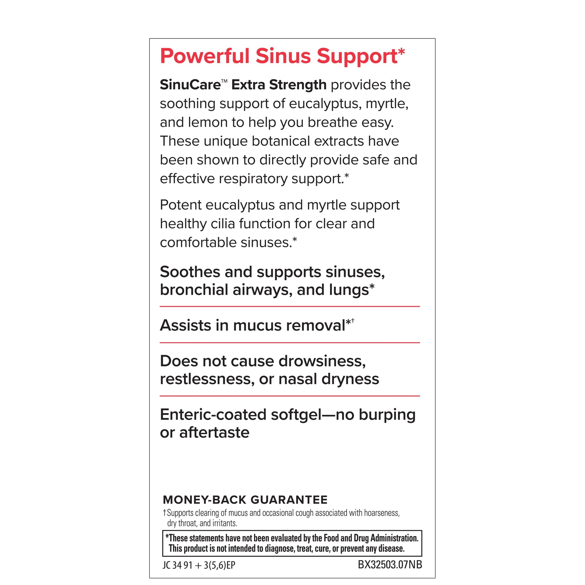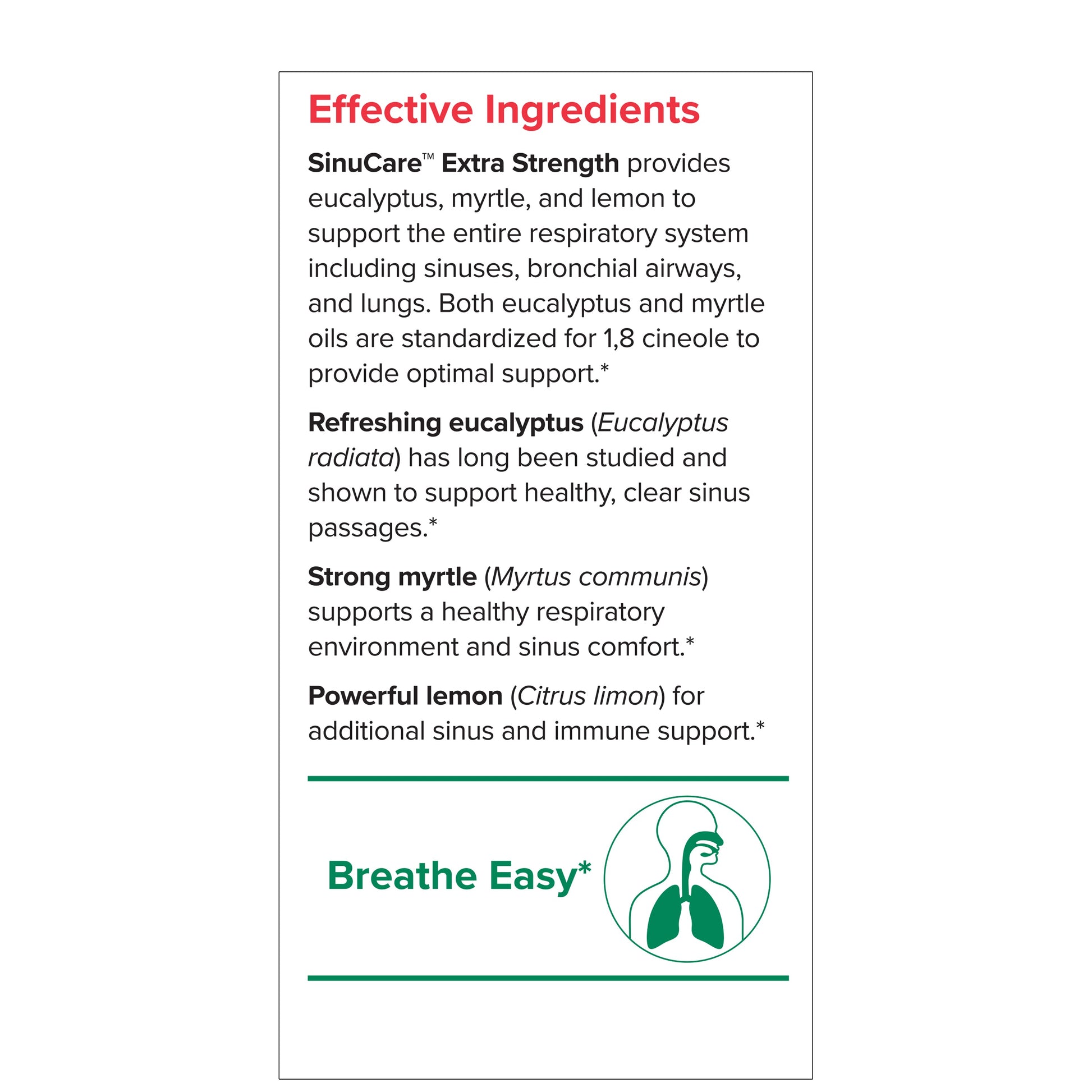 SinuCare Extra Strength provides Eucalyptus, Myrtle and Lemon oil to support sinus, bronchial, lung, and entire upper respiratory function.