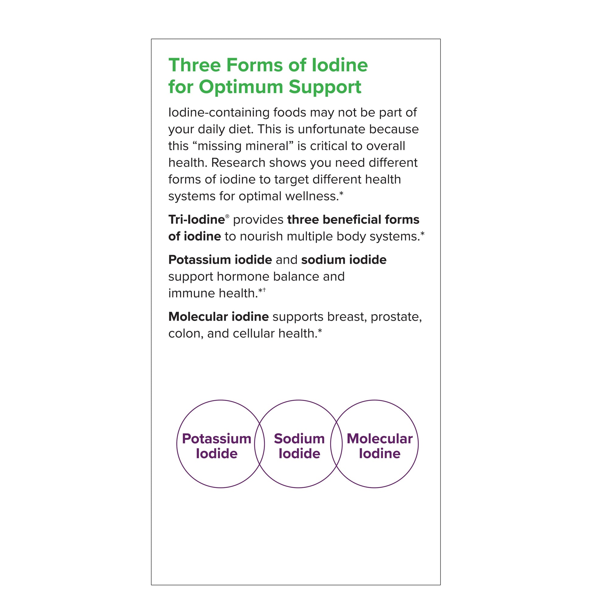 Tri-Iodine provides three beneficial forms of iodine to nourish multiple body systems: a blend of potassium iodide, sodium iodide, and molecular iodine. Three forms of iodine provide a wider spectrum of benefits: