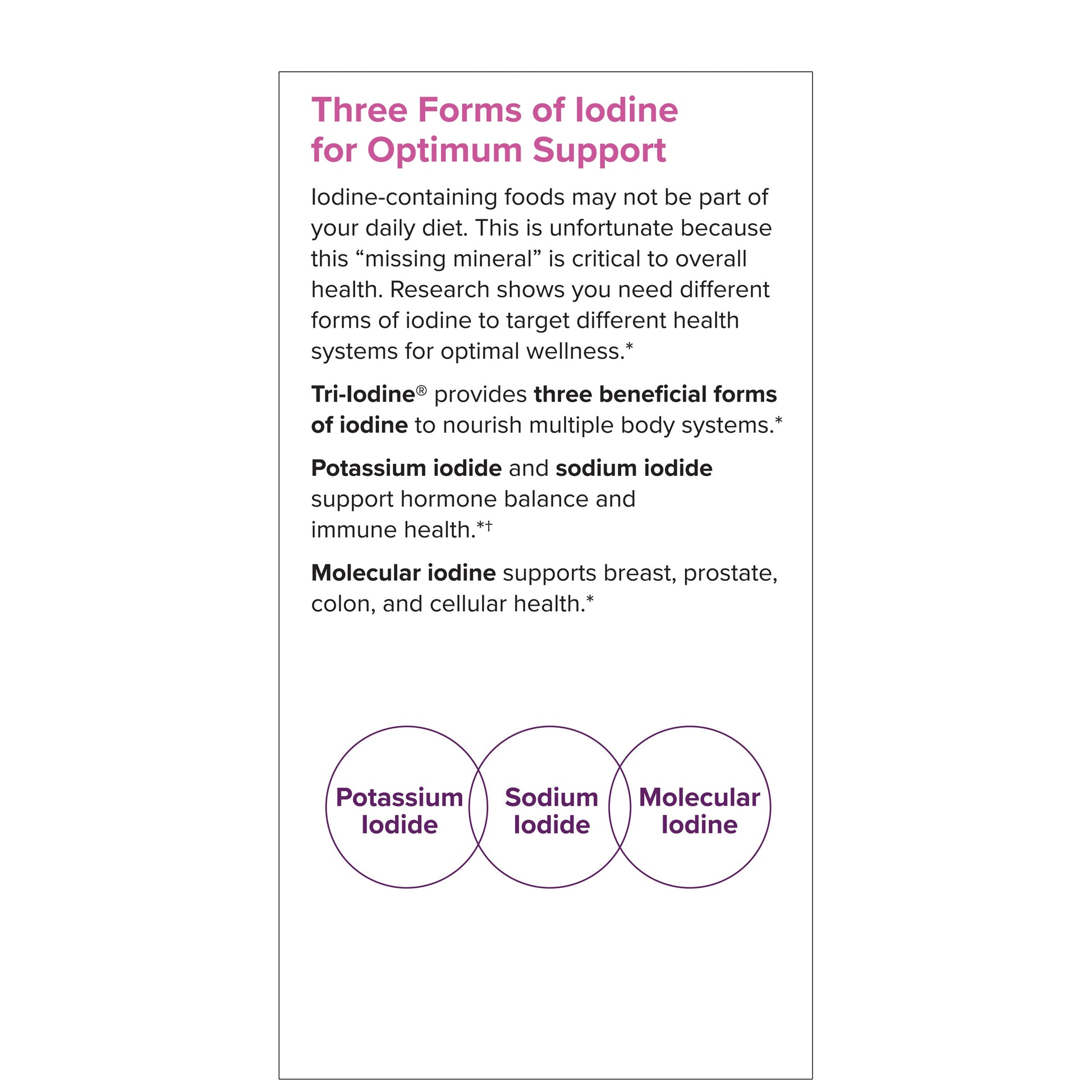 Tri-Iodine provides three beneficial forms of iodine to nourish multiple body systems: a blend of potassium iodide, sodium iodide, and molecular iodine. Three forms of iodine provide a wider spectrum of benefits:
