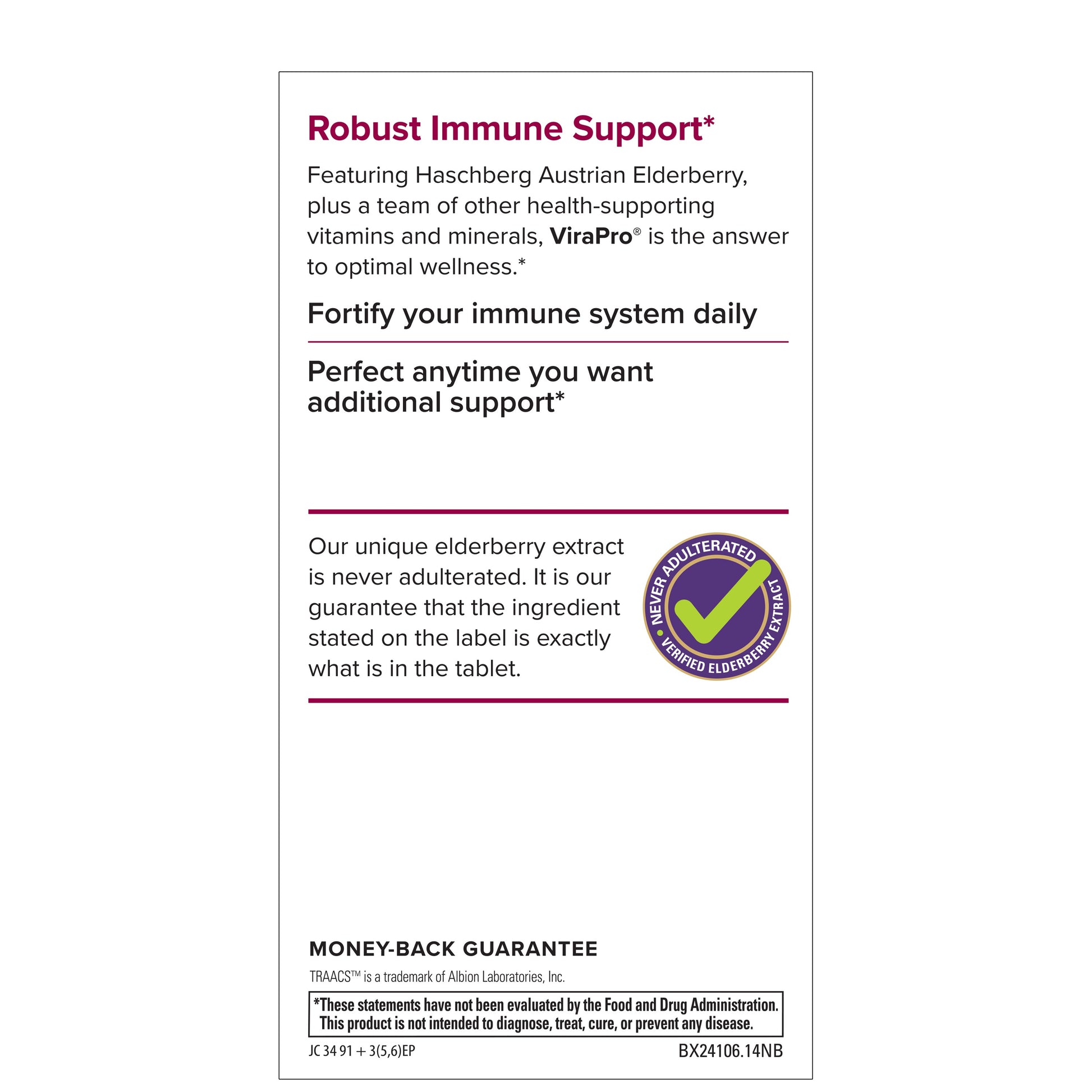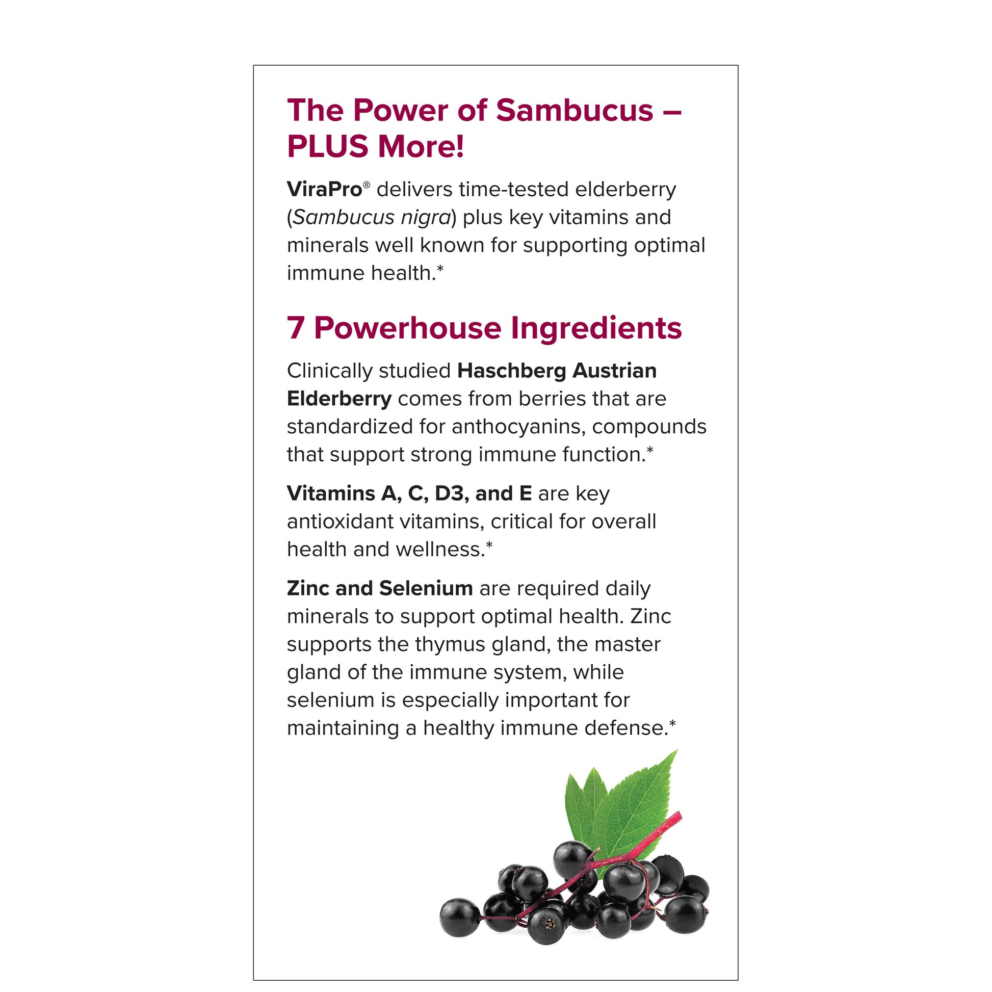 ViraPro features clinically studied Haschberg Austrian Elderberry, freeze-dried to preserve all the beneficial nutrients from the entire berry, along with important immune system vitamins and minerals.