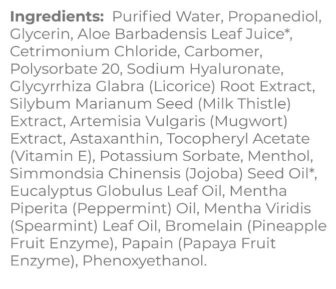 Purified water, propanediol, glycerin, aloe barbadensis leaf juice*, cetrimonium chloride, carbomer, polysorbate 20, sodium hyaluronate, glycyrrhiza glabra (licorice) root extract, silybum marianum seed (milk thistle) extract, artemisia vulgaris (mugwort) extract, astaxanthin, tocopheryl acetate (vitamin E), potassium sorbate, menthol, simmondsia chinensis (jojoba) seed oil*, eucalyptus globulus leaf oil, mentha piperita (peppermint) oil, mentha viridis (spearmint) leaf oil, bromelain (pineapple fruit enzyme), papain (papaya fruit enzyme), phenoxyethanol.