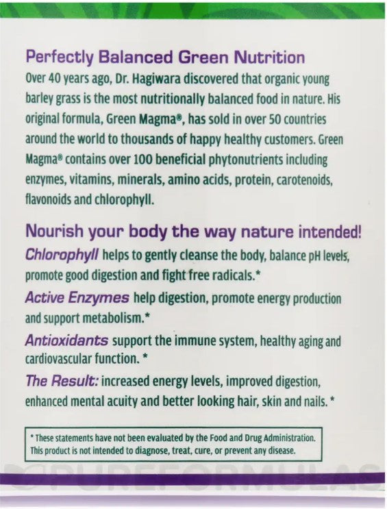 Over 40 years ago, Dr. Hagiwara discovered that organic young barley grass is the most nutritionally balanced food in nature. His original formula, Green Magma, has sold in over 50 countries around the world to thousands of happy healthy customers. Green Magma contains over 100 beneficial phytonutrients including enzymes, vitamins, minerals, amino acids, protein, carotenoids, flavonoids and chlorophyll.