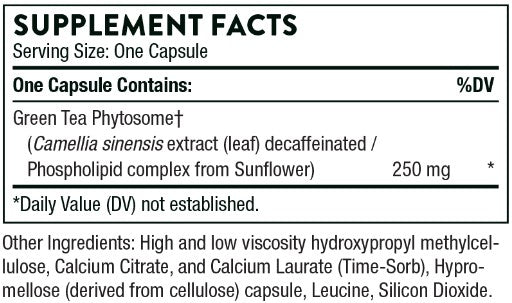 Green tea is popular for its antioxidant properties and its thermogenic (fat burning) effect.* Thorne's Green Tea Phytosome contains powerful antioxidant polyphenols, and it exhibits further antioxidant effect by helping to maintain the body's level of glutathione, another important antioxidant.* Green tea extracts can increase natural energy expenditure and fat oxidation, thus essentially burning calories.* The polyphenols in green tea also offer liver-protective benefits and help maintain the body's normal inflammatory response to oxidative stressors.* Thorne's Green Tea Phytosome is optimally absorbed; for example, one study showed the peak blood concentration of the important polyphenol constituent EGCG from the Green Tea Phytosome complex, measured over six hours, was almost twice that of a non-complexed green tea extract.*