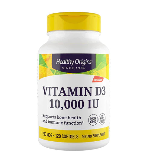 Healthy Origins Vitamin D3 10,000 IU is a key nutrient manufactured in a highly absorbable liquid softgel form. Vitamin D3 is synthesized in the body from sunlight and only a small amount can be obtained from food. The winter season and most sunblock products inhibit the body's ability to produce optimal levels of Vitamin D. As a result, Vitamin D3 supplementation becomes even more necessary to ensure your body receives an adequate supply.