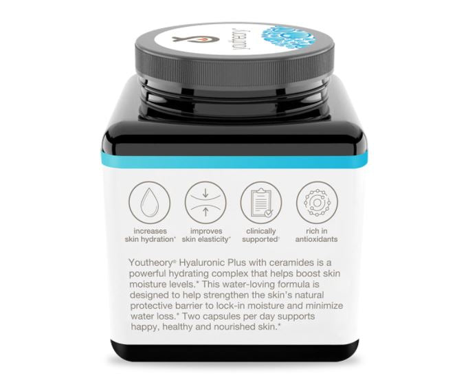Youtheory® Hyaluronic Plus with ceramides is a powerful hydrating complex that helps boost skin moisture levels. This water-loving formula is designed to help strengthen the skin’s natural protective barrier to lock-in moisture and minimize water loss. Two capsules per day supports happy, healthy and nourished skin.