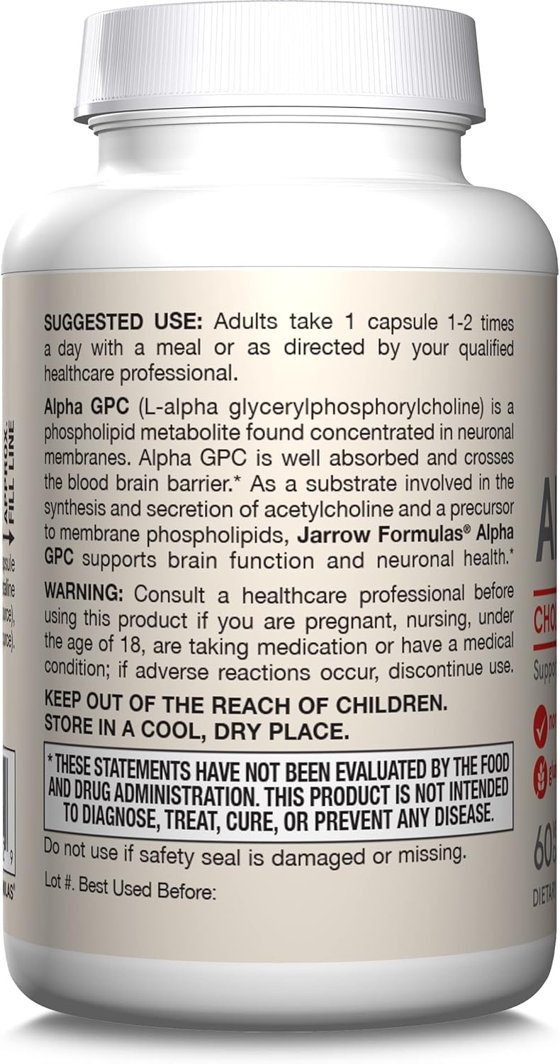 Alpha GPC (L-alpha glycerylphosphorylcholine, also known as choline alfoscerate) is a phospholipid meta-bolite found concentrated in neuronal membranes. Derived from lecithin, Alpha GPC is extremely well ab-sorbed and crosses the blood brain barrier. In the brain, Alpha GPC supports brain function and learning proces-ses by directly increasing the synthesis and secretion of acetylcholine. Alpha GPC supports neuronal health and improves signal transmission by serving as a precursor to membrane phospholipids.