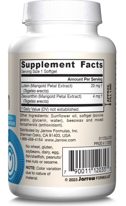 Jarrow Formulas Lutein is extracted from marigold petals. Each softgel contains 20 mg lutein (net yield) as free lutein, the form found in the macula.