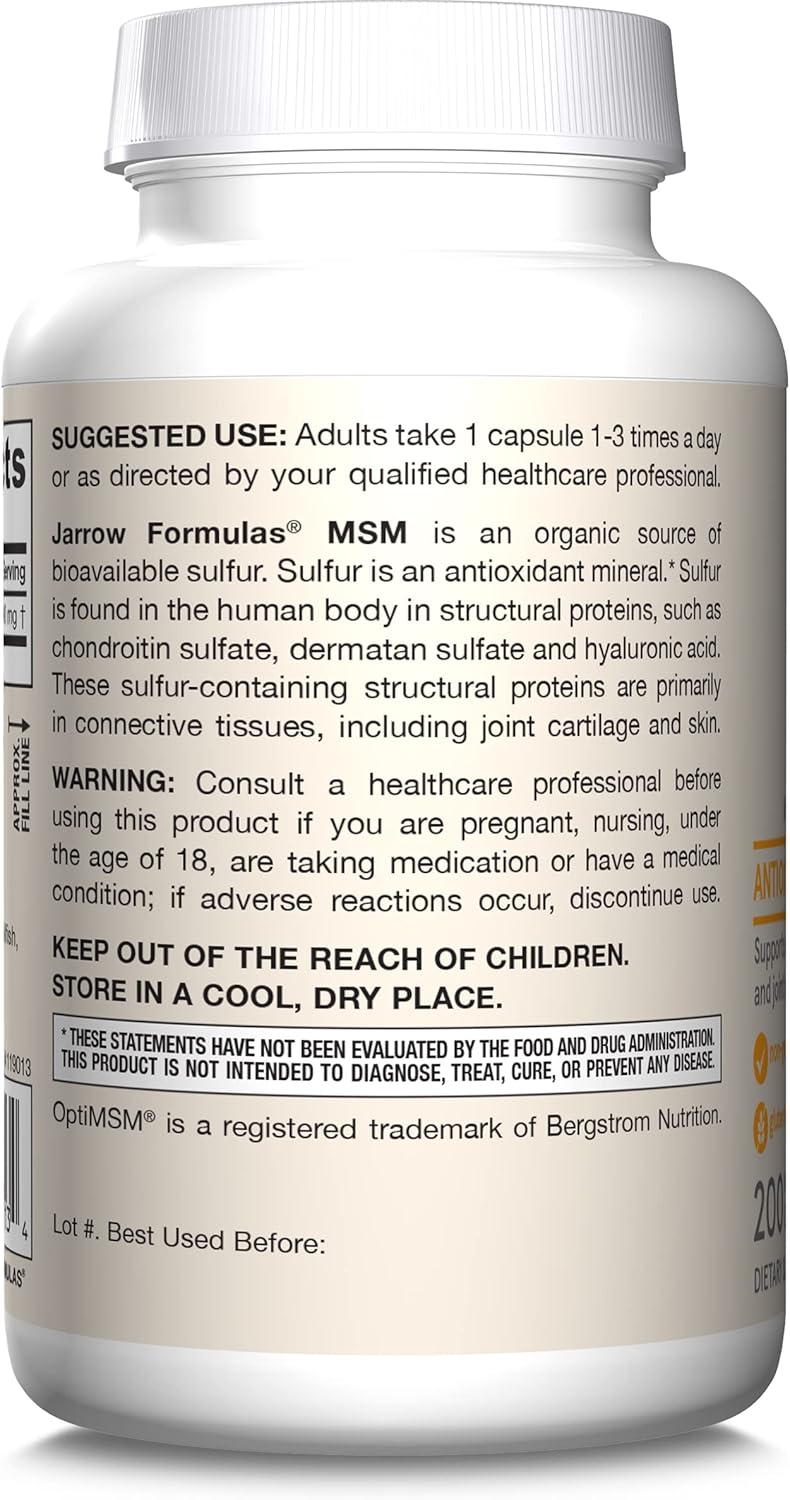 Jarrow Formulas MSM is an organic source of bioavailable sulfur. Sulfur is an antioxidant mineral found in major structural tissues of the body such as cartilage. The sulfur from MSM is used to produce glycosaminoglycans (or mucopolysaccharides) present in proteoglycans such as chondroitin sulfate, dermatan sulfate, and hyaluronic acid. These sulfur-containing glycosaminoglycans are found in high concentrations in connective tissues, including joint cartilage, skin and collagen.