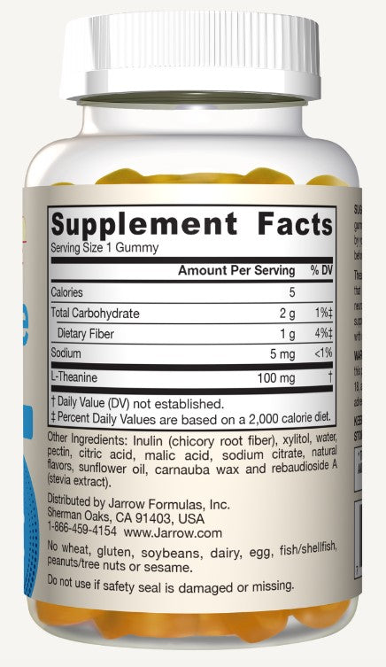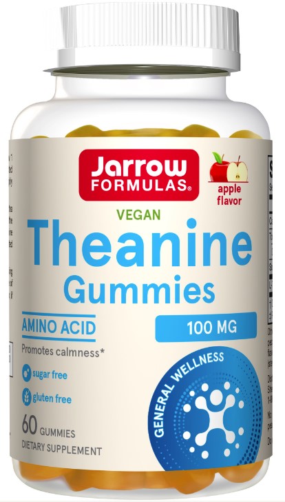Jarrow Formulas Theanine Gummies deliver 100 mg L-Theanine per gummy. Theanine is a unique amino acid found almost exclusively in green tea that exerts beneficial effects on brain metabolism. Theanine induces relaxation without causing drowsiness, as measured by increased generation of alpha-waves. Theanine may promote learning ability and calmness by affecting dopamine and serotonin neurotransmitters in the brain. Also, theanine may exert protective effects on the brain by helping to maintain healthy metabolism of glutamate.