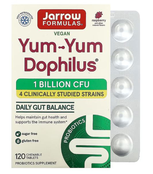 Jarrow Formulas Yum-Yum Dophilus provides 4 clinically documented strains of potent beneficial bacteria in a yummy chewable tablet. Beneficial intestinal flora can be negatively affected or reduced by a diet that is low in fiber, high in animal protein, the use of medication, travel and stress, etc. The result is dysbiosis (i.e., disruption of the normal intestinal microflora), which can negatively affect gastrointestinal function and well being.