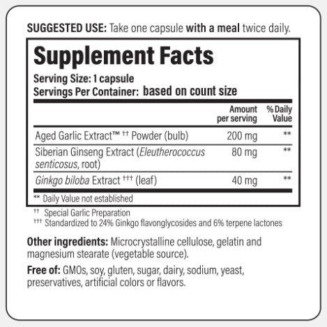 Aged Garlic Extract is a powerful antioxidant that can help support learning and protect the brain from oxidative damage. Eleuthero Ginseng Extract is a powerful adaptogenic herb that may improve brain function and enhance memory. Ginkgo Biloba Extract helps improve blood circulation to the brain, aiding in concentration and memory.