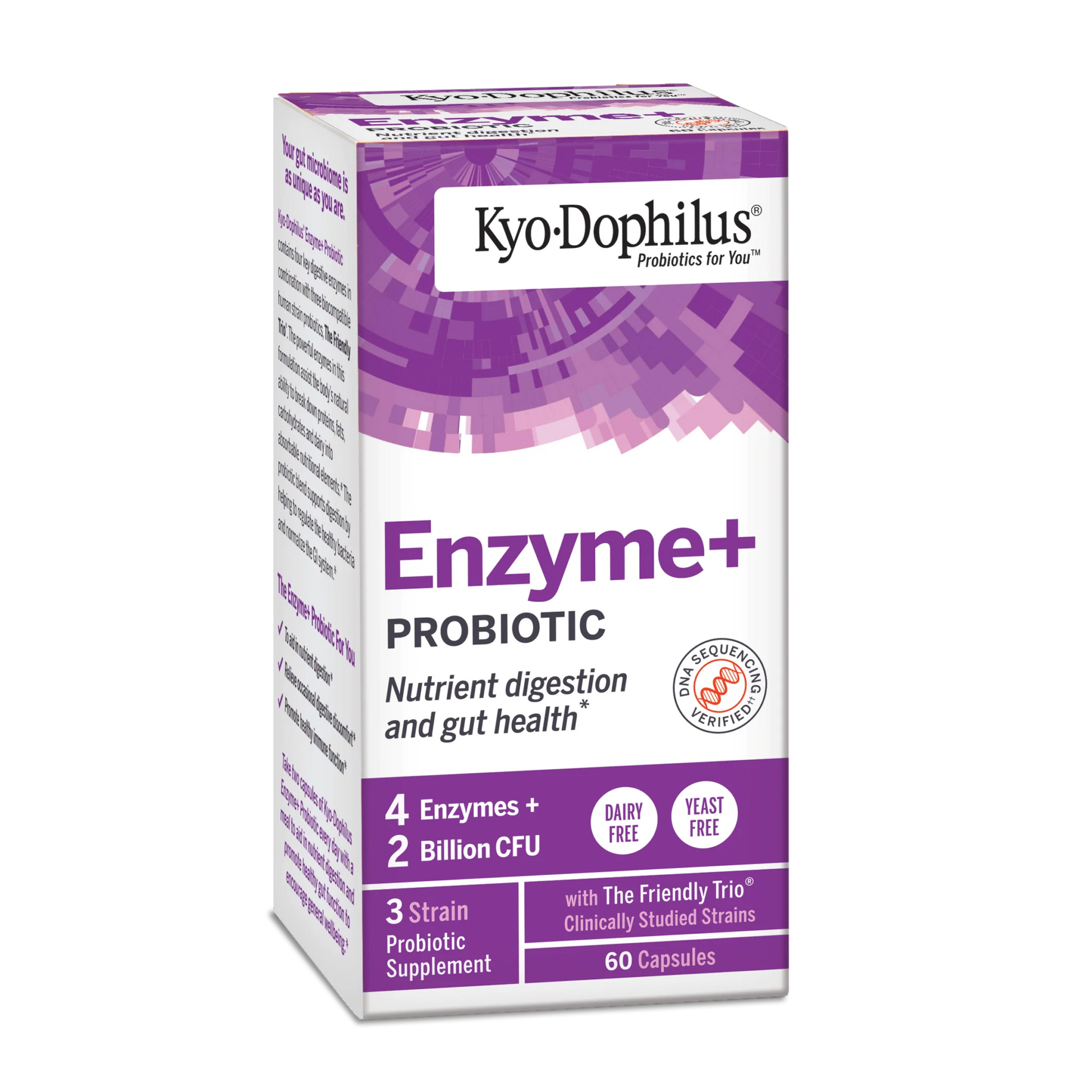 Kyo-Dophilus plus Enzymes contains four key digestive enzymes in combination with three beneficial human strain probiotics, The Friendly Trio, that are critical for balanced and healthy intestinal function. Four powerful enzymes assist the body's natural ability to break down proteins, fats, carbohydrates and dairy into absorbable nutritional elements. Take Kyo-Dophilus plus Enzymes everyday to support healthy digestive function, and help alleviate occasional gas and bloating.