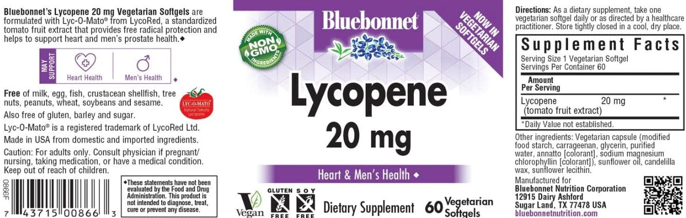 Lycopene 20 mg, 60 Vegetarian Softgels, by Bluebonnet