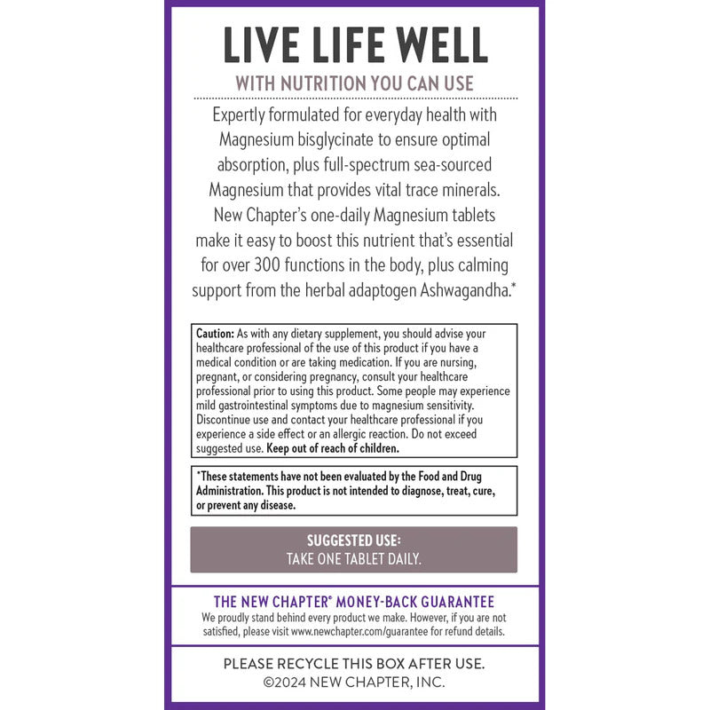 Did you know that Magnesium is an essential mineral, but nearly half of Americans aren’t getting enough? This deficit is caused by poor nutrition from refined foods, decreasing nutrients in our soil, and the effects of stress. Fortunately, New Chapter’s one-daily Magnesium glycinate tablets make it easy to boost this nutrient that’s essential for over 300 functions in the body. Magnesium plays a key role in cardiovascular health, energy metabolism, and nerve transmission. Our innovative Magnesium supplement includes the adaptogenic herb Ashwagandha for added stress support.