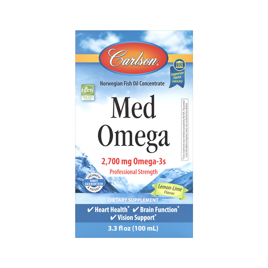 Carlson Med Omega™ is a highly concentrated, balanced, professional-strength formula. It provides 2,700 mg of omega-3 fatty acids per teaspoonful, including 1,180 mg each of EPA and DHA. Med Omega™ has a delicious lemon-lime flavor that's received numerous awards for its taste and quality.