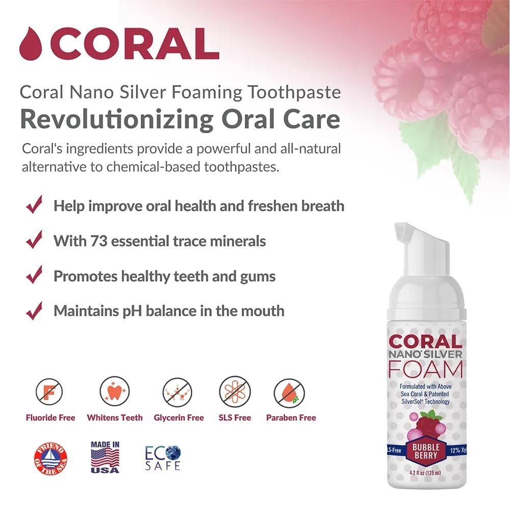 Coral fluoride free bubble berry foaming toothpaste is the perfect oral care companion for kids. A non toxic 100% safe to swallow toothpaste that is specially formulated to make brushing a fun and enjoyable experience while promoting healthy teeth and gums. Our Bubble Berry Foaming Toothpaste is infused with a delightful berry flavor that kids will love, making brushing time a breeze. It combines the benefits of coral calcium and xylitol to provide a natural and effective approach to oral care.