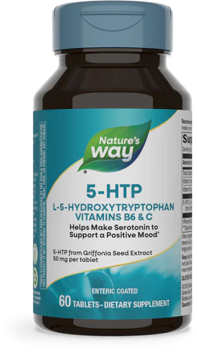 l-5-Hydroxytryptophan is the precursor to serotonin. Nature's Way uses natural l-5-HTP extracted from Griffonia simplicifolia beans produced in easy-to-swallow, enteric-coated tablets to minimalize any potential gastric discomfort. It has been combined with Vitamin C and Vitamin B6.