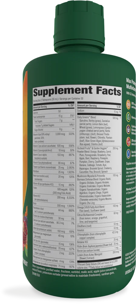 Our Max Potency Multivitamin, in a delicious citrus liquid! Alive! Liquid Multi is a convenient option for those who don’t like to swallow tablets. Take it once daily all by itself, or mix it into your favorite beverage or smoothie for a power packed treat.