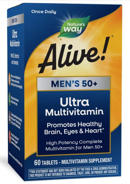 Alive! Once Daily Men's 50+ formula is the most complete and nutritionally diverse once daily multivitamin optimally balanced for men 50+. It features unique nutrient blends such as eleuthero, rhodiola and korean ginseng for energizing your mind and body, saw palmetto and lycopene for prostate support and resveratrol, CoQ10 and hawthorn for cardiovascular support.