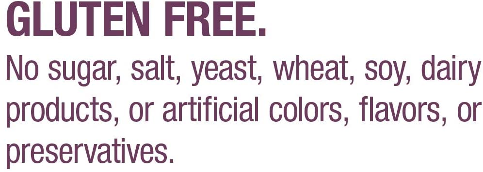 Gluten-free and vegan. No salt, yeast-derived ingredients, wheat, soy, dairy, or artificial colors, flavors, or preservatives.