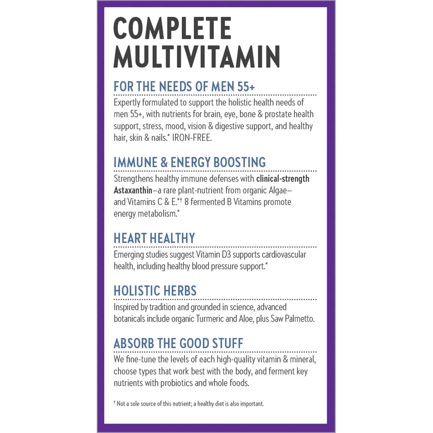 Expertly formulated to support the holistic health needs of men 55+, with nutrients for brain, eye, bone and prostate health support, stress, mood, vision and digestive support, and healthy hair, skin and nails. Iron-Free.