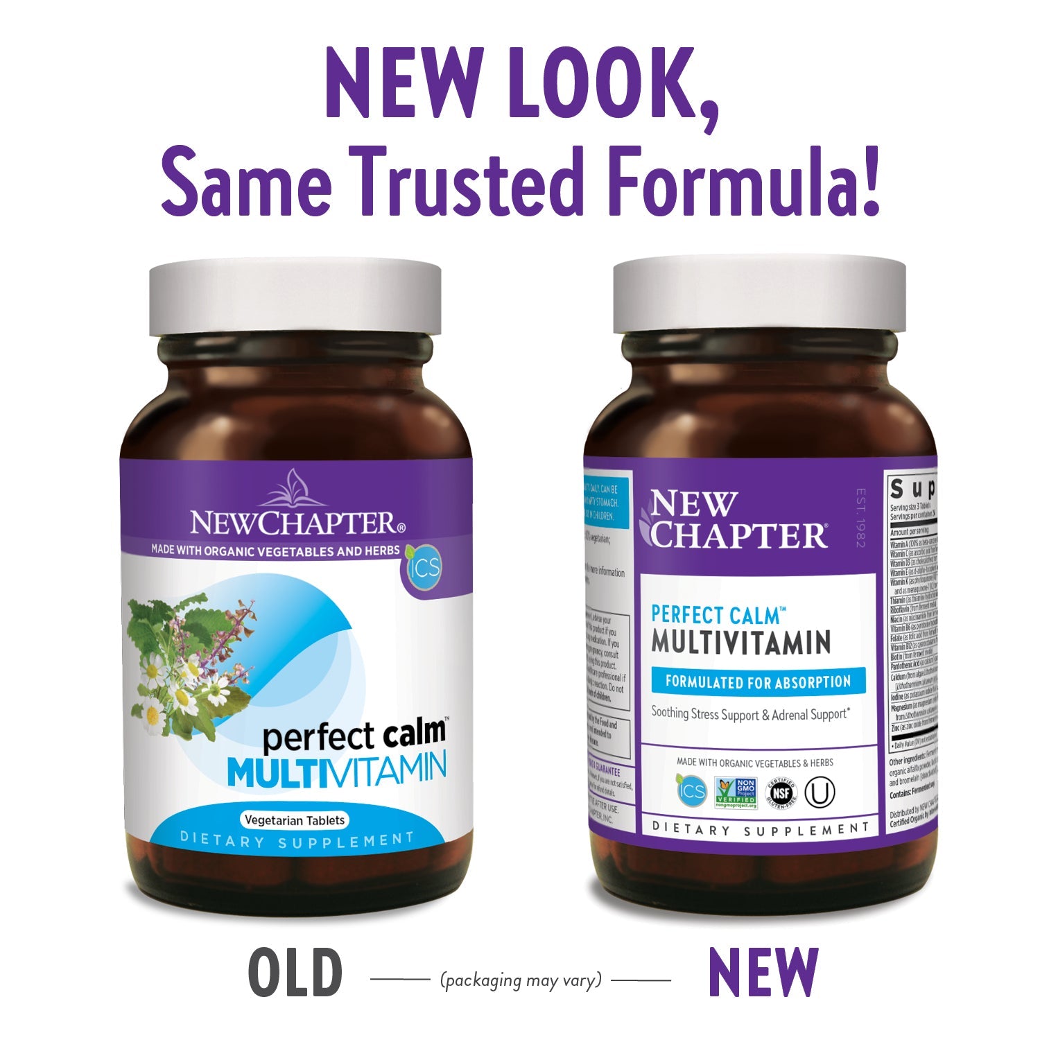 Perfect Calm is the ideal organic whole-food complexed multi-vitamin herbal and nutrient formula for those seeking to address daily stress, enhance calm and overall well-being. It is the first and only multi-vitamin to feature the long revered anti-stress herb Supercritical Holy Basil, which has been shown in scientific studies to modulate cortisol and ease a worried mind. Chamomile and Lemon Balm offer additional soothing effects by promoting healthy levels of calming neurotransmitters. A complete multi-vitamin, Perfect Calm provides a combination of 25 whole-food complexed vitamins and minerals formulated to promote optimal health while targeting the nutrients your body needs most during times of stress, like whole-food complexed Vitamins B and C. Perfect Calm also contains cultured, organic herbal blends to provide immune and digestive support — two important functions that can be affected by high levels of stress.