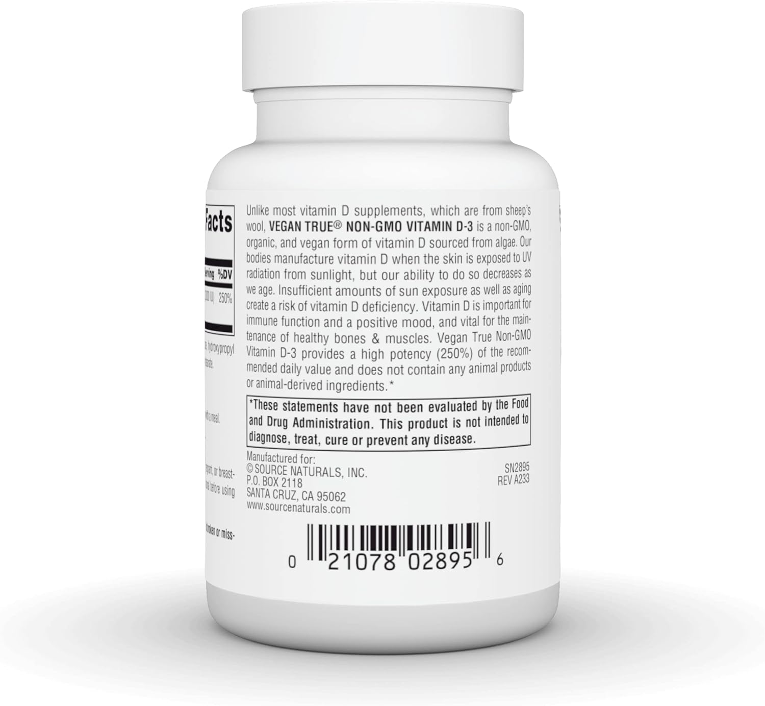 Unlike most vitamin D supplements, which are from sheep's Wool, VEGAN TRUE® NON-GMO VITAMIN D-3 is a non-GMO, organic, and vegan form of vitamin D sourced from algae. Our bodies manufacture vitamin D when the skin is exposed to UV radiation from sunlight, but our ability to do so decreases as we age. Insufficient amounts of sun exposure as well as aging create a risk of vitamin D deficiency. Vitamin D is important for immune function and a positive mood, and vital for the maintenance of healthy bones & muscles. Vegan True Non-GMO Vitamin D-3 provides a high potency (250%) of the recommended daily value and does not contain any animal products or animal-derived ingredients.